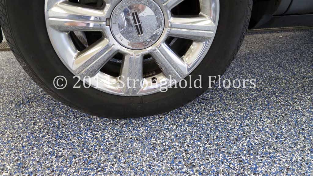 On Saturday, our team returned to clean up all excess chips and get ready to apply the clear, top coat of polyaspartic urethane. This ultra glossy (Gardner Color Scale of 1), clear material was applied with a broadcast of aluminum oxide – which promotes increased wet & dry slip resistance.