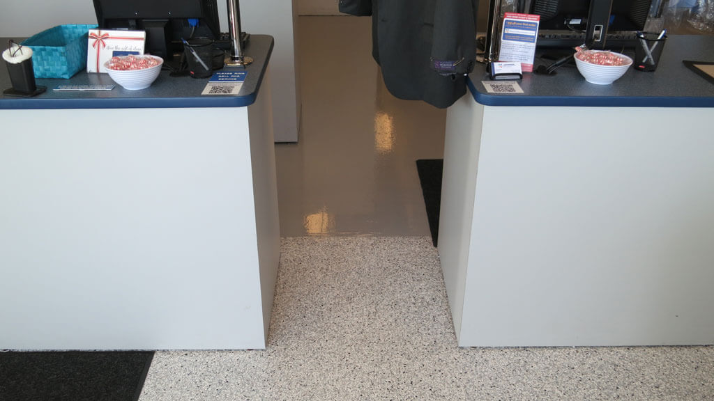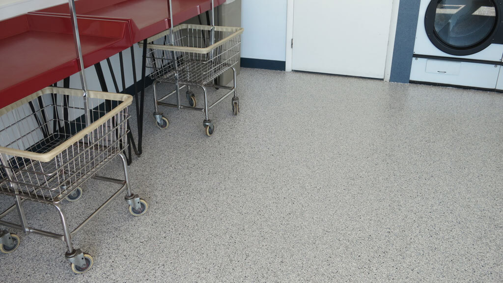 The decorative chip floor in this lobby and solid color epoxy in the laundromat area of Classic Drycleaners is comprised of: